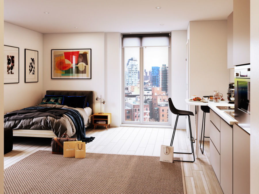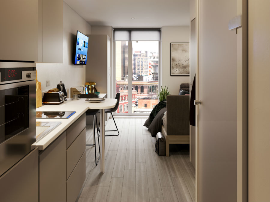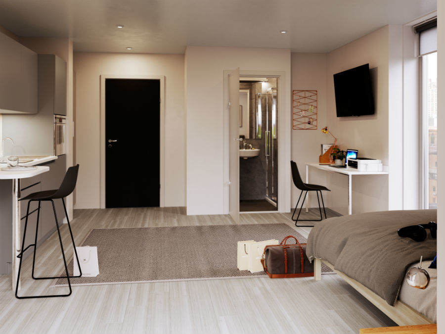 The modern palette of materials and finishes in the communal spaces are echoed throughout the student apartments. All apartments are fully furnished with stylish kitchens and quality modern appliances. Space and light are plentiful. Each apartment includes a private kitchen and dining area, en-suite bathrooms, study spaces and generous living areas that are flooded with light. The floor to ceiling window design of the building impactfully contrasts with the modern brickwork of the building’s exterior.